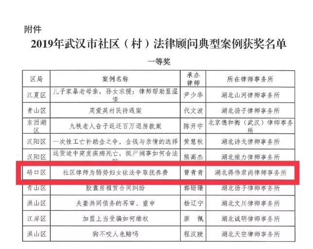 湖北得伟君尚律师事务所青年律师曹青青办理的《社区律师为弱势妇女依法争取抚养费》荣获2019年武汉市社区(村)法律顾问典型案列一等奖。