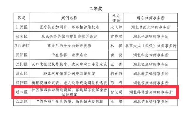 曾长明律师办理的《社区律师参与街道调解,咨询解答化解噪音信访积案》荣获2019年武汉市社区(村)法律顾问典型案例二等奖。